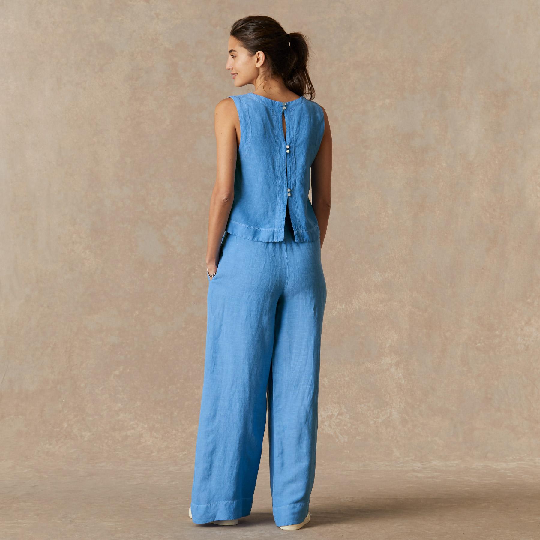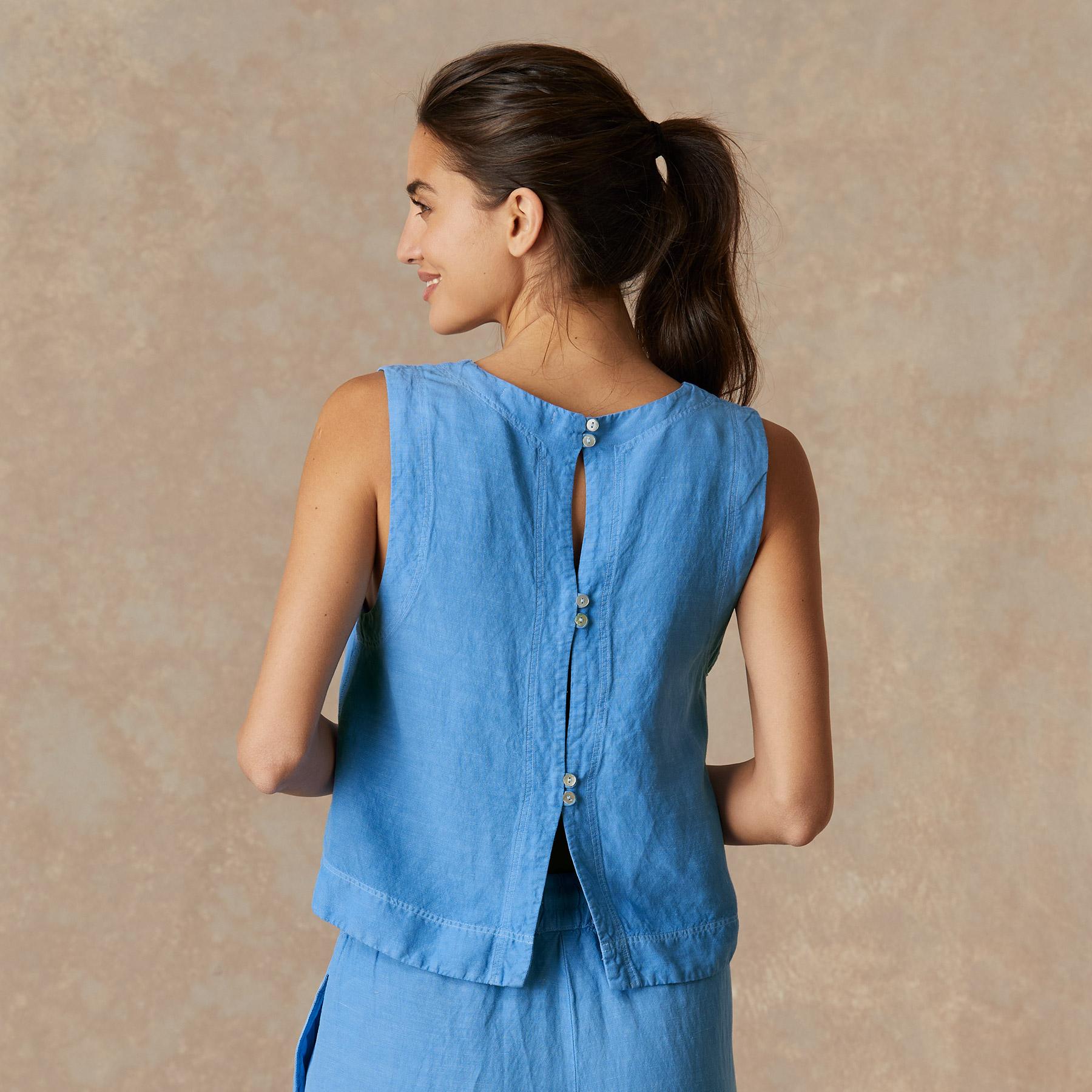 Decorative stitching and double buttons add a touch of flair to this airy tank. Linen/rayon. Dry clean. Made in USA. Sizes XS (0-2). S (4-6). M (8-10). L (12-14). XL (16-18). Approx. 20.5l.