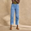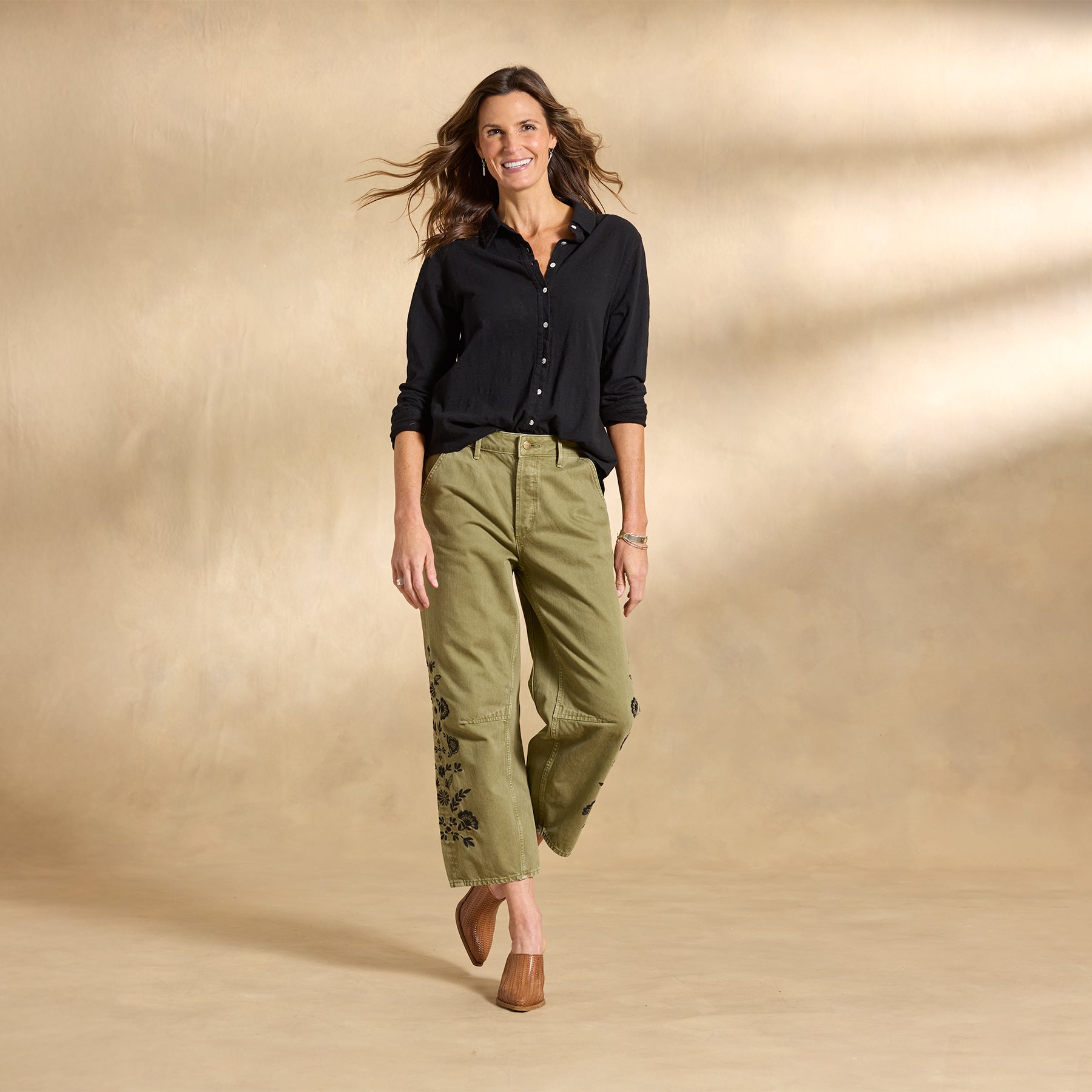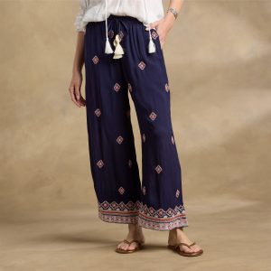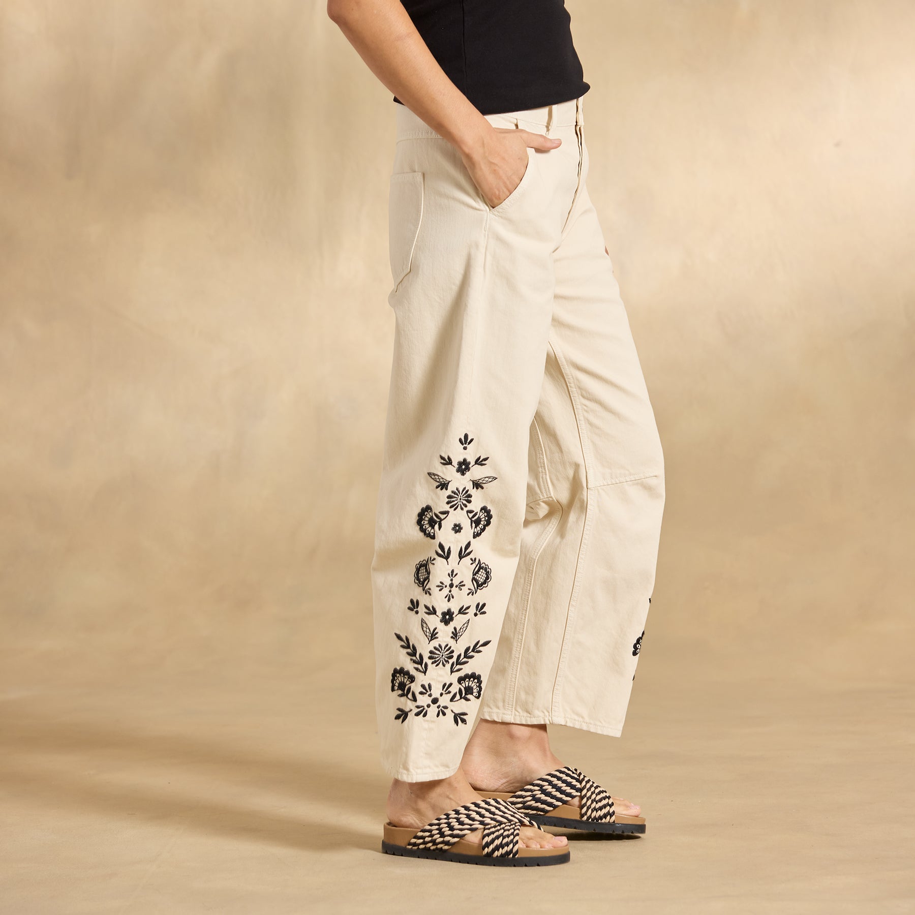 These ankle-length. barrel-leg pants cut a flattering silhouette. with black floral embroidery on both legs. front slit pockets. two back pockets and knee seaming. 100% Cotton. Machine wash. Imported. Sundance exclusive. Sizes 24?C32. 26 inseam