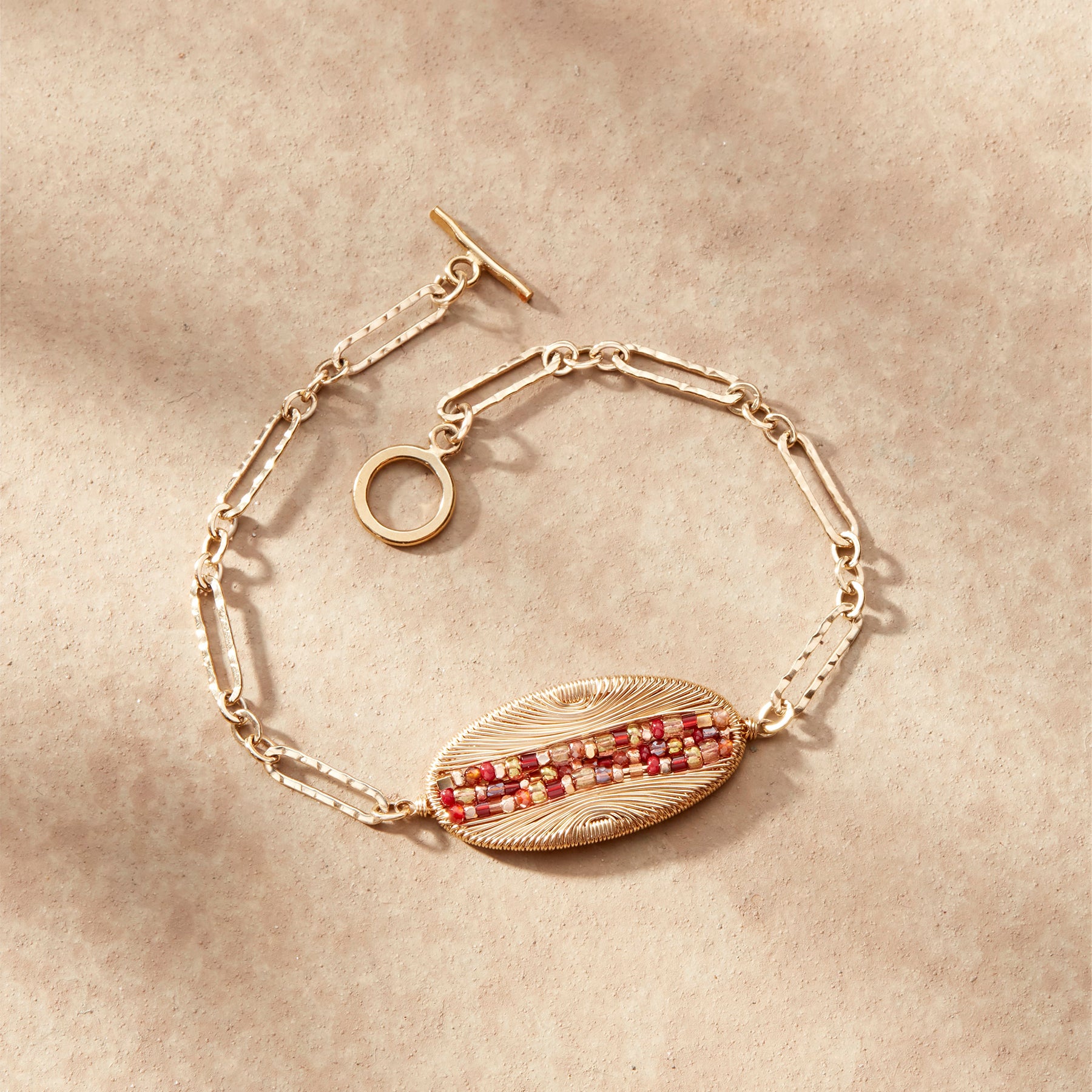 Garnet. glass and 10kt gold-plated sterling silver beads blaze a trail through an oval frame filled with signature cocoon wire wrapping. 14kt gold-filled frame. lobster clasp and chain; 12kt gold-filled wires. Handmade in USA. 7-1/4l.