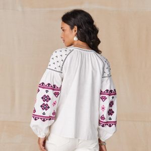 This breezy. boho-style top features allover embroidery. blouson sleeves. decorative stitching and tassels. Size down for a more true to size fit. Cotton. Hand wash. Imported. Exclusive. Sizes XS (0-2). S (4-6). M (8-10). L (12-14). XL (16-18). XXL (20-22). Approx. 24l.
