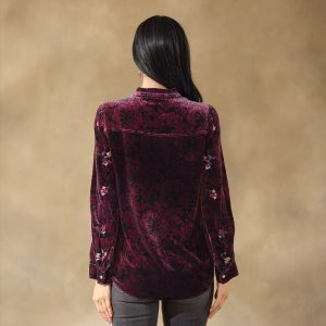 Inspired by a garden in full bloom—colorful embroidery blossoms on our printed. relaxed fit top with ruffle detail at the notch neckline and loop button closure at the henley placket. Viscose/silk. Dry clean. Imported. Exclusive. Sizes XS (0–2). S (4–6). M (8–10). L (12–14). XL (16–18). XXL (20–22). Approx. 25.5l.