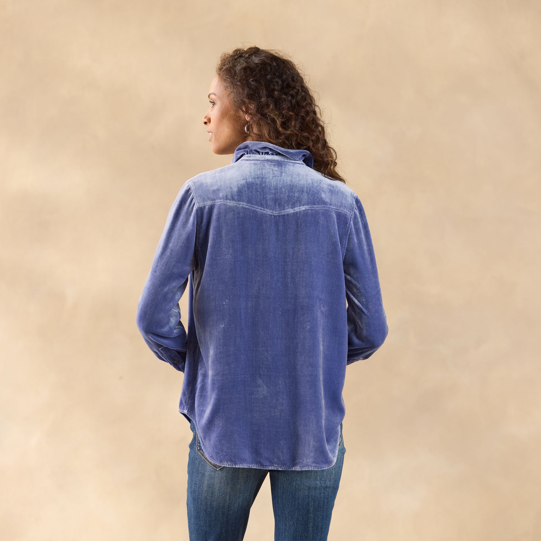This Western inspired. soft velvet shirt is beautiful with ruffles at the neckline for a feminine twist. Two patch pockets. snap closure and bandana print detail inside. Viscose/silk. Dry clean. Imported. Exclusive. Sizes XXS (00). XS (0?C2). S (4?C6). M (8?C10). L (12?C14). XL (16?C18). Approx. 24l.
