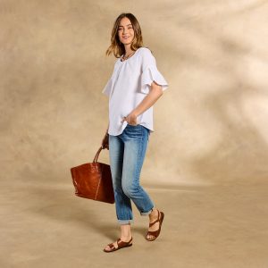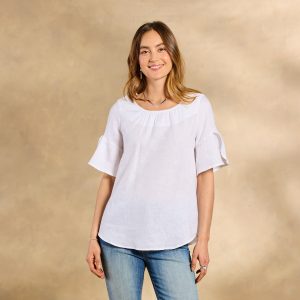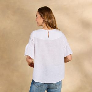 You’ll feel free in our flowing and relaxed top with elegant flutter sleeves and shirring at the neckline. Keyhole at the back with button closure. Linen. Hand wash. Imported. Exclusive. Sizes XXS (00). XS (0–2). S (4–6). M (8–10). L (12–14). XL (16–18). Approx. 23l.