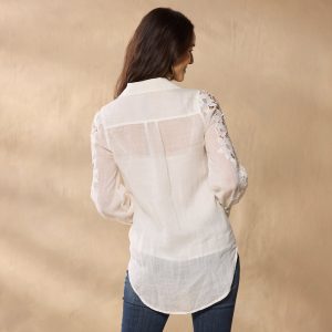 Stunning open applique and eyelet details lend feminine beauty to the sleeves and front bodice of our Monrovia Shirt with covered buttons and lace trim. Cotton/linen. Hand wash. Imported. Exclusive. Sizes XXS (00). XS (0?C2). S (4?C6). M (8?C10). L (12?C14). XL (16?C18). Approx. 25.5l.