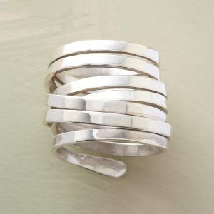 In this wraparound ring. a single length of sterling silver coils around the finger as randomly as a vine around a tree. Hammered surfaces mark the beginning and end points. Exclusive. Whole sizes 5-10. 3/4w. Hand wrapping will vary slightly.