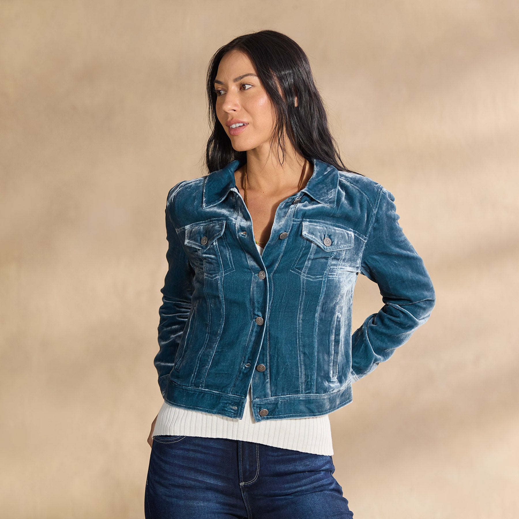 A classic jean jacket silhouette. but in soft. subtly shimmery velvet. Dress it up or down. Fully lined. Four pockets. Viscose/silk. Dry clean. Imported. Exclusive. Sizes XXS (00). XS (0??). S (4??). M (8??0). L (12??4). XL (16??8). Approx. 20l.